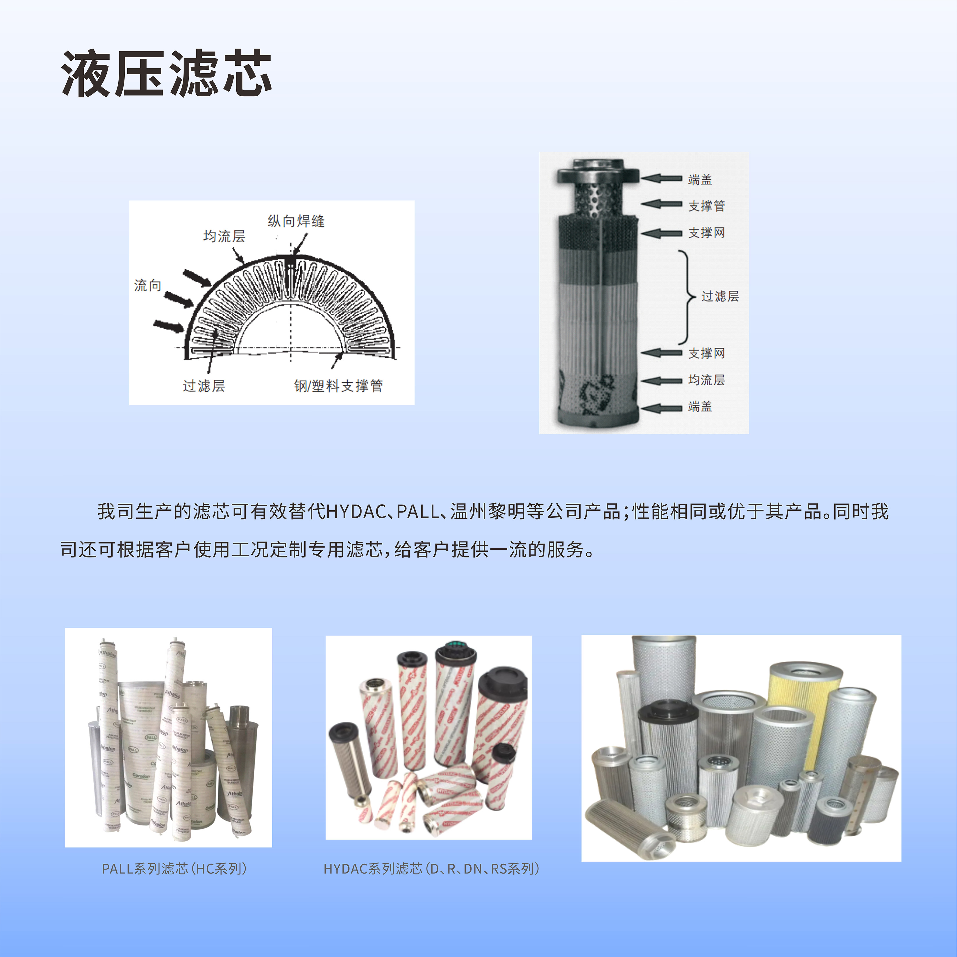 【產品簡介】:液壓濾芯由上、下端蓋,濾層(由過濾層、支撐層、均流層)以及骨架組成,濾層以圓柱體的形狀以圓柱體的形狀固定在內、外骨架之間,并在上、下端蓋處密封,應用時根據實際情況確定液體的流動方向(從濾芯外流向濾芯內部或從內部流向外部)。流量:400L/min 精度:80、100、180微米可選。